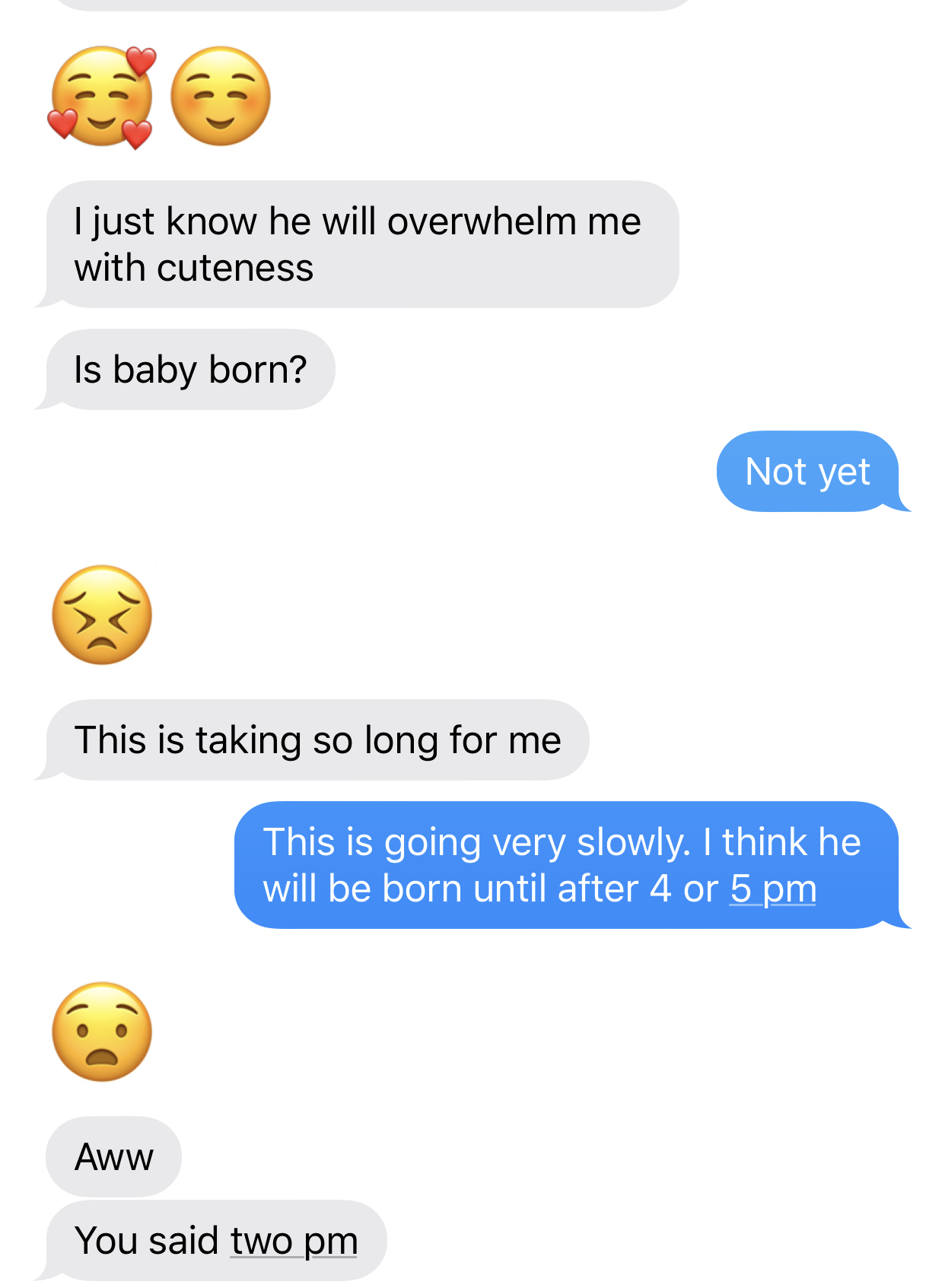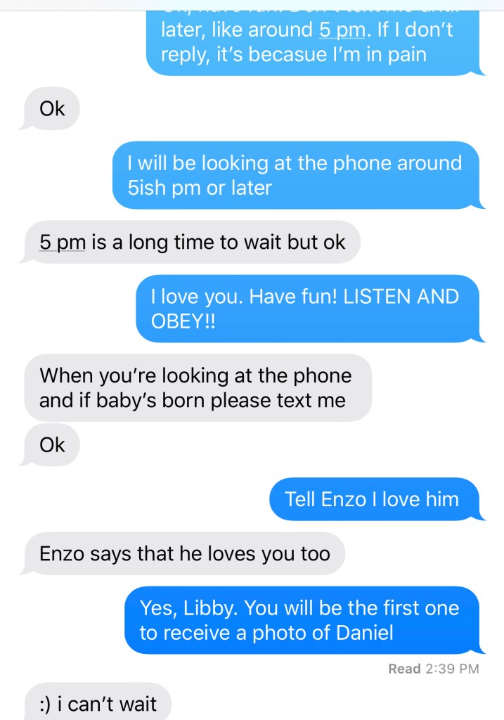 Besides all the pain, I had an over-obsessed daughter texting me and inquiring of my status constantly. Never mind her Mommy, she wanted a Baby. I wanted to be mad at her, but I just couldn’t. She did’t mean anything by it. If it had been my mom, then sure. Libby, however, was so anxious to know if I had had the baby that she was truly disappointed every time she texted me and I had no baby to show her yet!