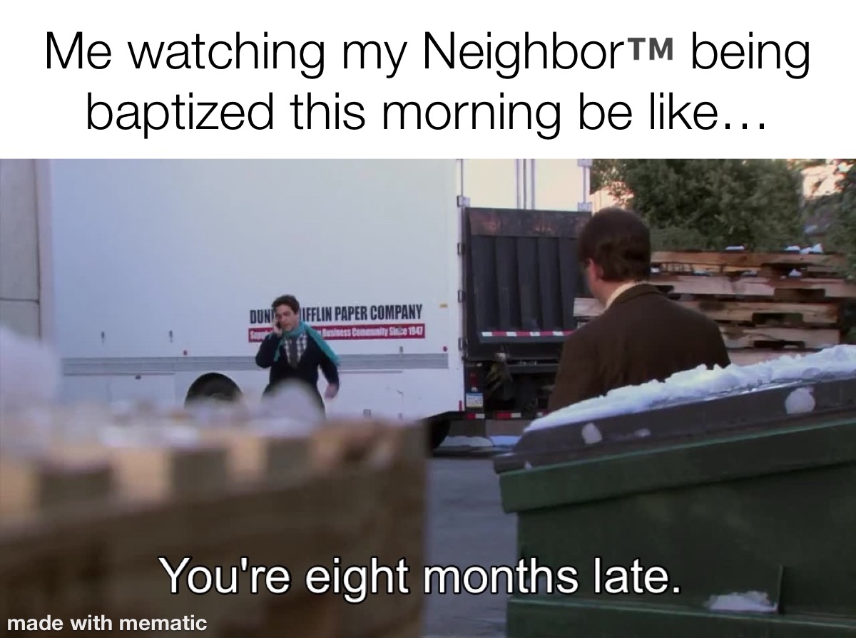 I did not really hug him back. I think I actually pushed him away gently, but I did hug his youngest son whose freckles I loved. Then I said hi to the middle one, I gave him a hug, and I totally embraced his oldest son who was getting baptized. Then it hit me. My neighbor is being baptized too.