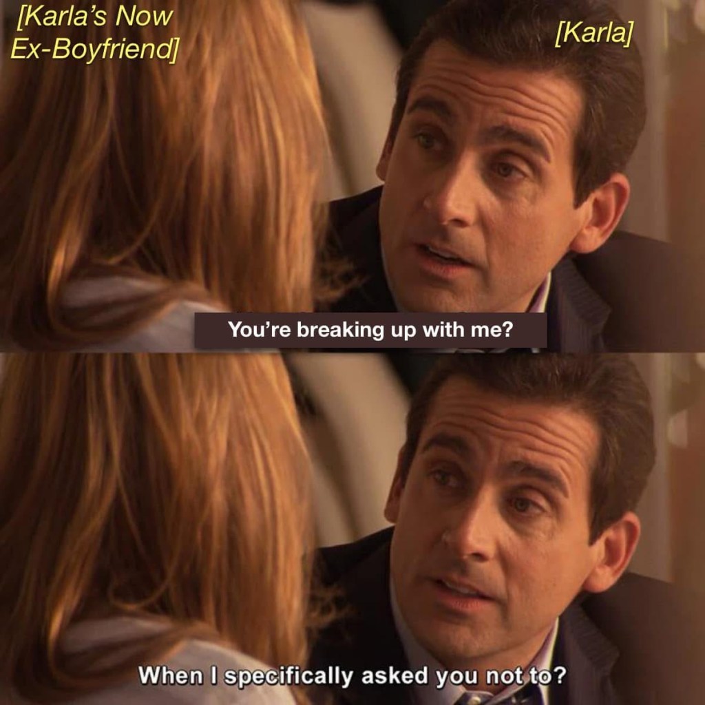 “Of course not. I purposely ignored your texts because you could have apologized to my face just the same way you should have broken up with me – to my face. Twenty steps, dude. You could have gone downstairs, knocked on my door, and told me we were done.”